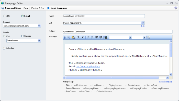 10. Merge Tags - the tags from the Subject or Message which will be replaced with campaign specific values. For example the <<FirstName>> tag will be replaced with the recipient's first name