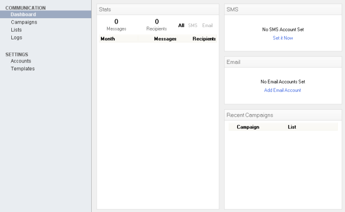 Each sending session is defined in the system as a Campaign . A campaign consist in a List of patients, a message to be sent and an Account from which the message is sent. In case of emails the message is an HTML email message and the the account is an email account. For SMS the message is a text message and the account an account in our gateway.