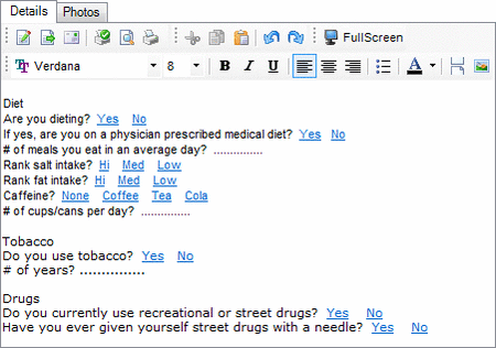 Questionnaires can be inserted into to contents of any Medical Record and there filled up. For example, you can insert questionnaire into a consultation by opening a consultation and pressing the Insert Questionnaire link. Once inserted you can fill up the form the by clicking on the links. You can continue typing text into the content..