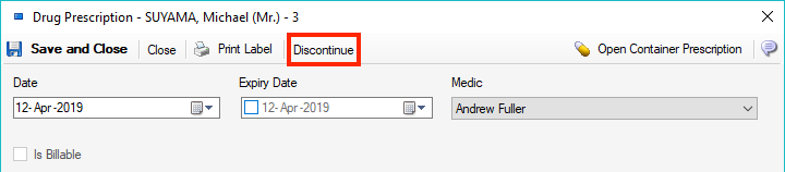 To discontinue a prescription, edit an existing prescription ( e.g. from Prescriptions ) and press Discontinue as bellow: