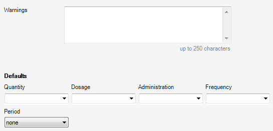 You can set default values for a drug prescription fields like Dosage, Administration, Frequency and Period. When prescribing, these fields will be automatically filled with the default values, after a drug is selected