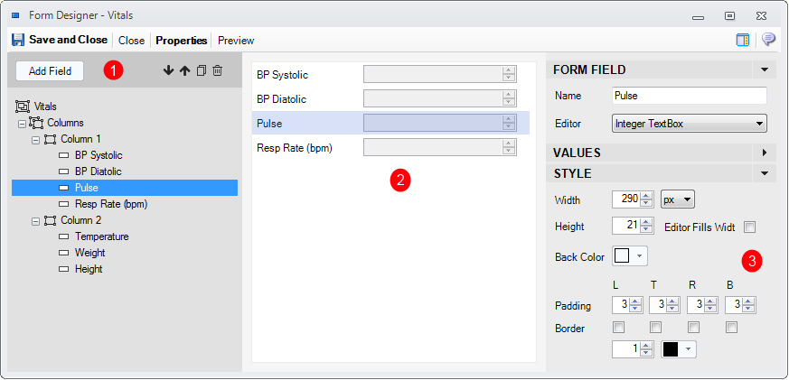 The right panel (3) is the properties panel, and allows the editing of the properties of the selected element, either section or field