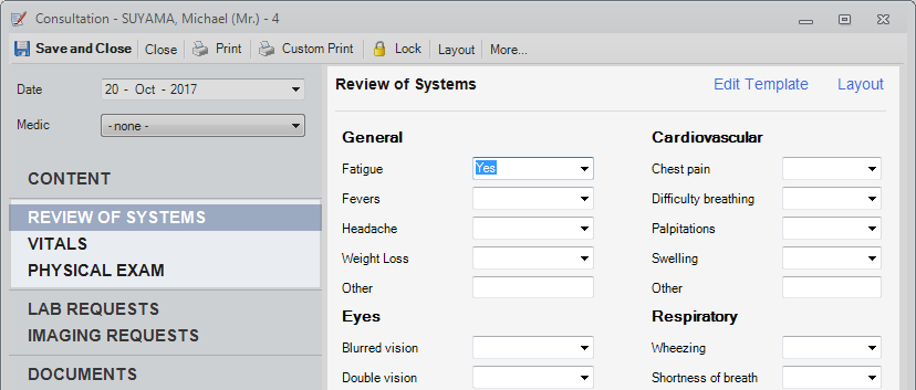 By default the system will display on the left sidebar the following Form Categories: Review of Systems, Vitals and Physical Exam.