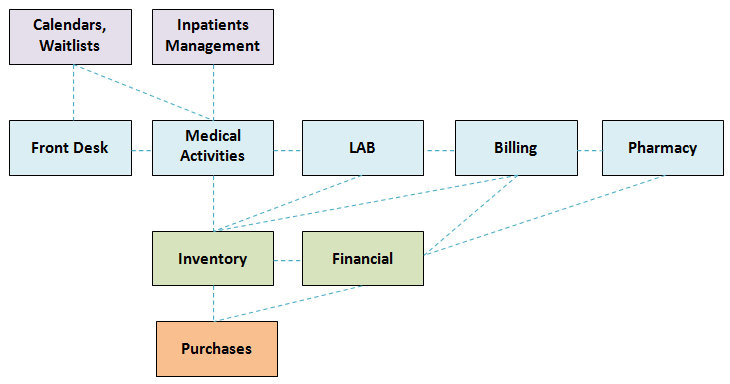 - Medical Activities - Patients are consulted and treated by medics. Medical records, services and consumed materials are entered by either the medic or by an assistant