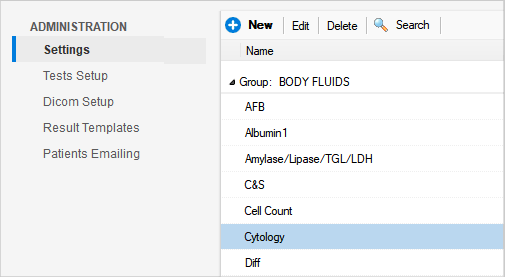 - the tests – along with their group and associated test fields