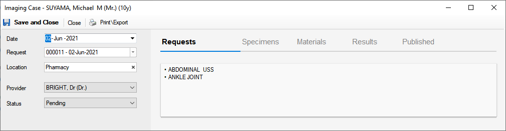 Test Cases can be generated from Imaging Requests, detail the specimens and materials used, and further simplify the test values entry by providing the fields specific to the requests