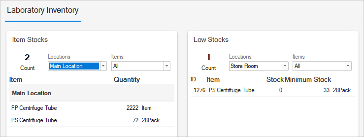 The Lab staff can quickly check the inventory on hand or low stocks: