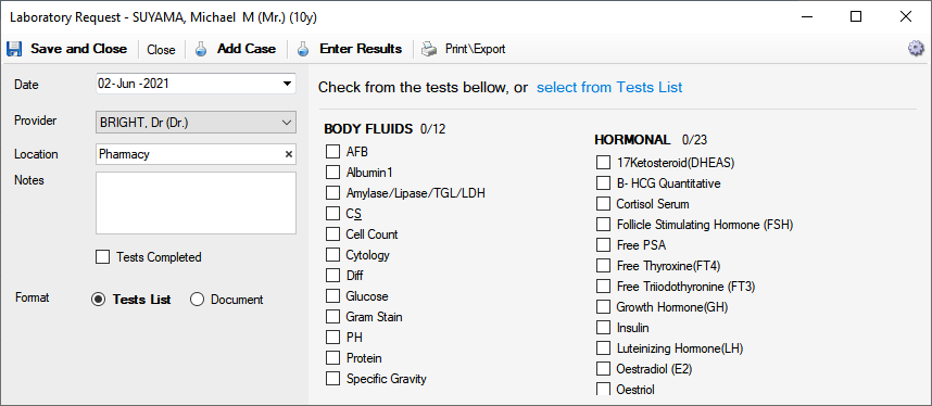 5.1. Format - Tests List - you can request test from using a list of check boxes as above, whose items can be billable automatically. More at Tests Setup