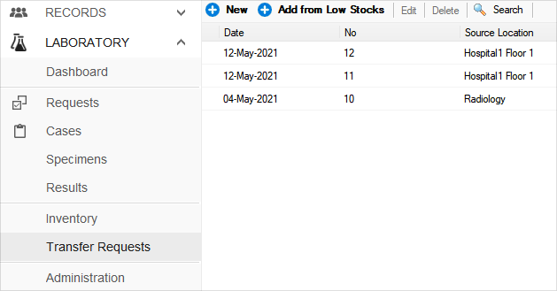 Laboratory Lab Transfer Requests The Lab staff can now request inventory for needed items, or for low stock items: