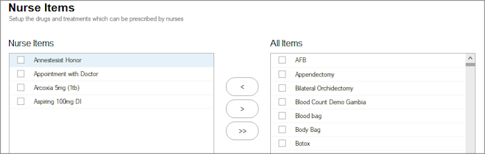 On the right grid you have availlable all the items in the database. To mark them as nurse items, simply check the items you want to mark and press the < button to add them to the left grid. Once added, the items in the left grid will be usable by nurses as nurse items.