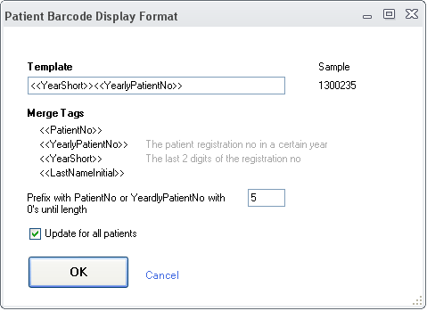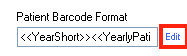 In the opened window configure the format of the Patient Barcode format with the merge fields <<LastNameInitial>> and <<PatientNo>>, as in the example bellow: