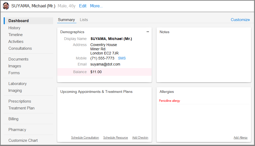 The Patient Chart provides with the view and the management all the aspects related to a patient: demographics, appointments, medical records, documents, images, imaging, lab, billing and pharmacy.