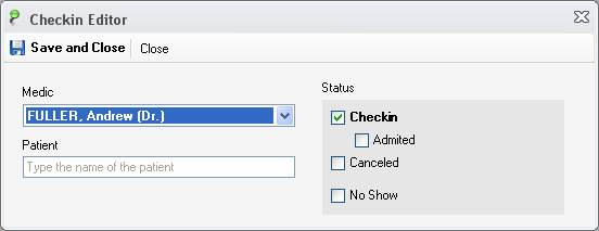 1. Check in a patient - click the Add Checkin on the toolbar or right click on a medic's list and select Add Checkin