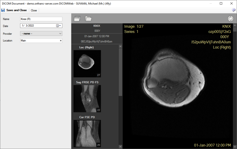 5. In the opened Dicom Document Editor, fill out any needed fields and press Save and Close