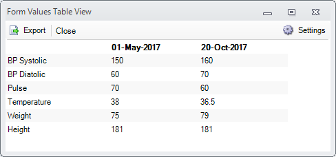 Form Values from separate patient forms can be exported from Form Editor -> Table View