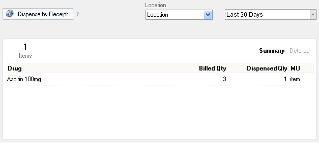 It displays all the billed drugs that satisfy the Location and date range filter