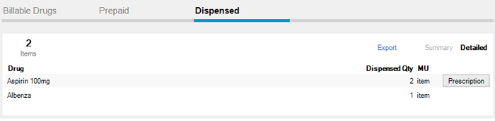 It displays the billable drugs, the prepaid drugs and the dispensed drugs for a patient. The operation on this view can be limited by administrators from Permissions