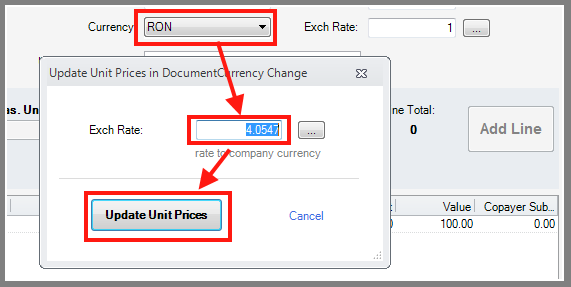 Complete the billable items with your work flow and build your invoice\receipt. Here simply change the currency and you will be prompted to update the unit prices with an exchange rate as bellow: