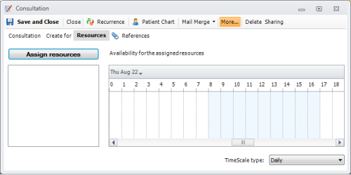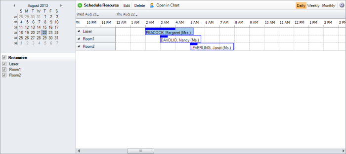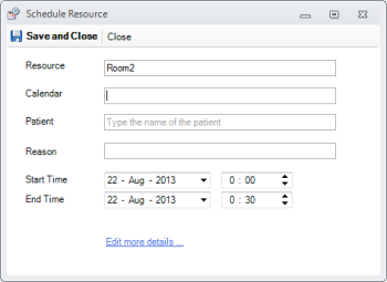 Double click on the time slot where you want to schedule a resource. The Schedule Resource Editor will open and you can select the calendar on which the resource will be scheduled and the time interval. Also you can enter the Patient and optionally the reason