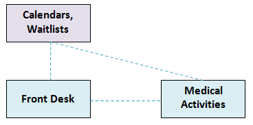 • Front Desk - Patients first encounter the Front Desk. Here the demographics are entered and the patients is put on a medic's wait list