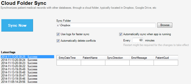 Sync Folder synchronizes all the patients medical records with the specified cloud folder. The files in the folder are xml files, with one file per patient. Any changes in the database are mirrored into the folder, and propagated to the other databases.