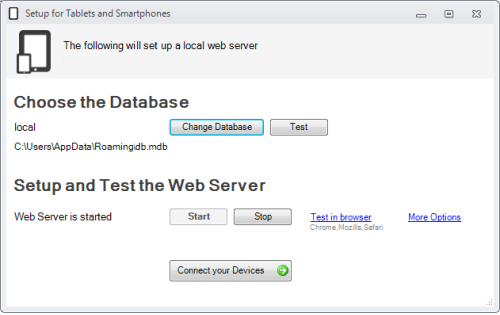 Next press the Start button, which will start your web server and you will be ready to connect your devices to it. By default the web server will automatically start on the computer restart.
