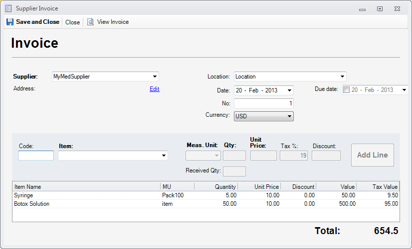 The purchase invoice should look like bellow. Press Close and Save