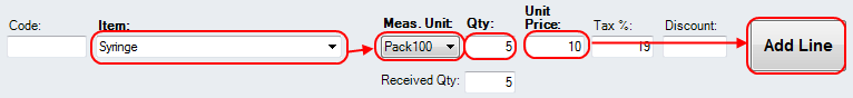 Go to Purchases->Invoices and create a purchase item for 5 pack of seringes and 50 Botox units(items). The entering of the 5 packs (500 syringes) should be like bellow: