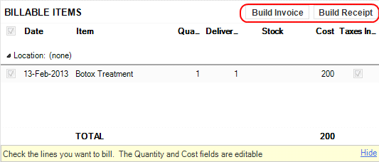 Go to Patient Chart->Billing. To bill the Botox Treatment press the Build Invoice or Build Receipt