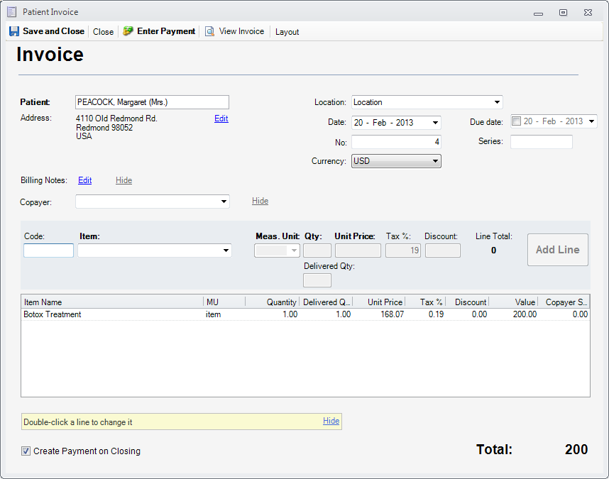 Typically Build Invoice is used when the amount will be paid later – thus enabling balance for the patient, and Build Receipt when the amount is paid on the spot. The invoice should look like bellow:
