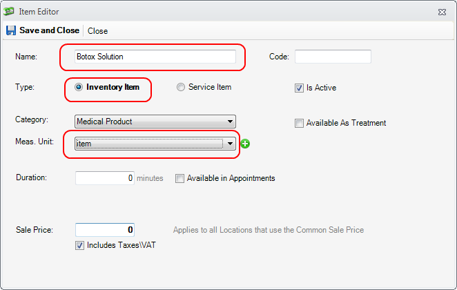 2. Create the consumables as inventory items - Botox Solution, Syringe
