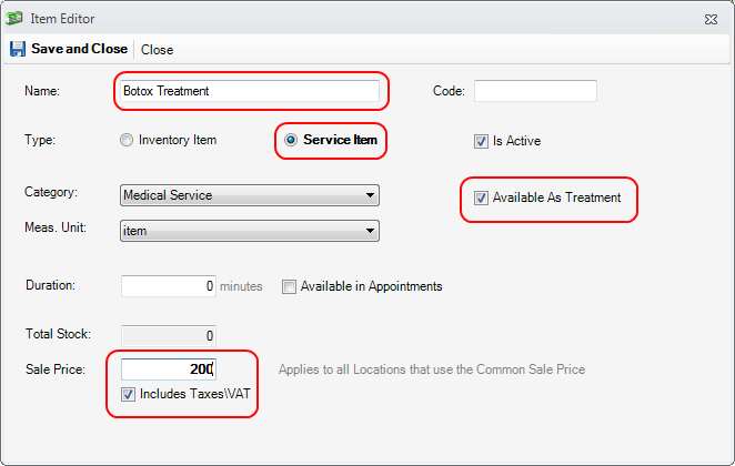 1. Create the treatment as service item - Botox Treatment