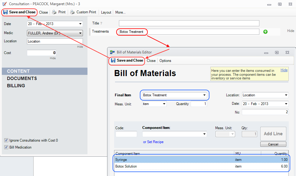 A bill of materials should open, prefilled with the consumable values that were defined in the Recipe. If you need adjustment, you can edit the consumable quantities and event enter new consumables. When finished press Save and Close in the Bill of Materials, and next Save and Close in the Consultation