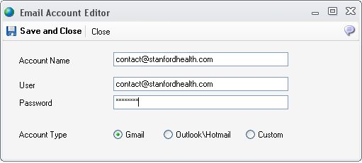 In the opened editor, complete the fields with your SMTP email user and password settings. These will be saved encrypted to the database.