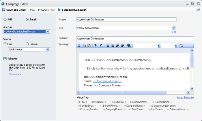 Bellow are the steps to build and schedule an email campaigns that request for patients' appointments confirmation, one day before the appointment.