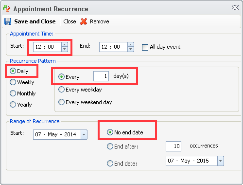 6. Check the Schedule check box and the press the Recurrence link. In the opened window choose as bellow and next press Save and Close
